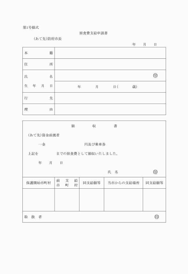 第五条 行旅困窮者が旅食費の支給を受けようとするときは、旅食費支給申請書(第一号様式)を市長に提出しなければならない。