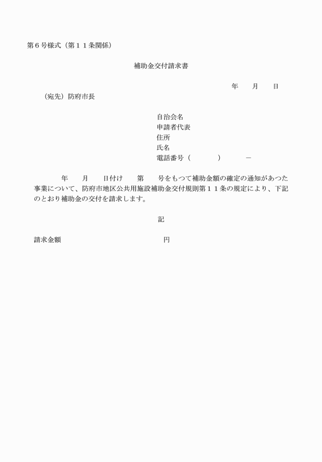 第六条 補助金の交付の申請をしようとする者は、事業に着手する前に補助金交付申請書(第一号様式)に次に掲げる書類を添えて市長に提出しなければならない。ただし、災害等により損壊した公共用施設の改造等が行われた場合であつて、その改造等が緊急かつ必要であつたと市長が認めたときは、当該改造等の着手後においても補助金の交付を申請することができるものとする。