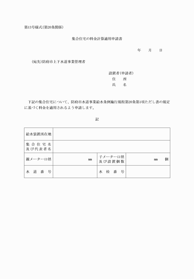 第一条 この規程は、防府市水道事業給水条例(平成二十二年防府市条例第三十五号。以下「条例」という。)の施行に関し必要な事項を定めるものとする。