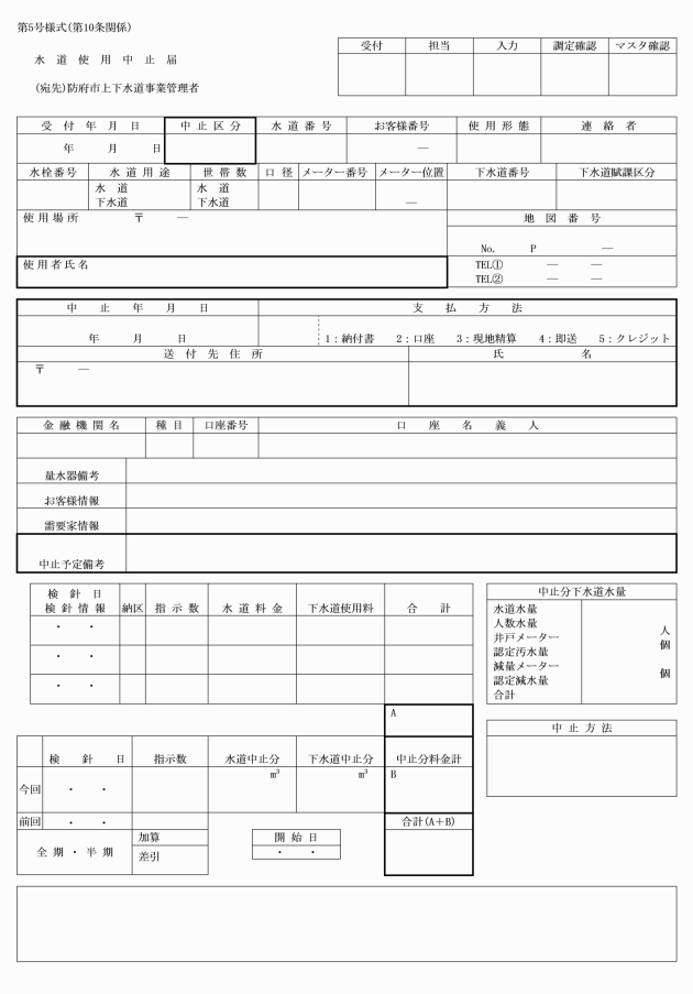 第五条 給水装置工事の承認を受けた者は、その設計を変更し、又は当該給水装置工事を取りやめようとするときは、直ちに管理者に届け出なければならない。