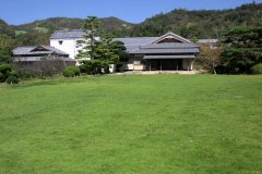 中雀門から大王松の許を過ぎると平庭が広がる。客殿前はゆったりとした広い庭、主人・奥方・子供部屋前は縁端に、下駄摺石を置き飛石を連ね、灯籠・手水石や樹木を配して、それぞれの間にふさわしい庭が造られている。 | ![]() |