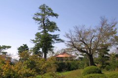 平庭南縁を流れる遣水を渡ると、ひょうたん池に突出する岬に出る。径1mもあろう老松が聳え、四阿屋風の休憩所がある。 |