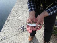 ”釣り情報”今朝の便で20人近い方がお見えです。お昼に東の波止に伺うと、殆どの方が「アジが数はまぁまぁ釣れるんじゃけど、形が小さいんよねぇ」と仰っていました。 ウーン、小さいね・・ 「釣れた中で一番大きいのがコレです」と若い方が見せてくださいました。 中波止では「小さいメバルがそこそこ釣れました」と船着場で教えて頂きました。 |
