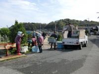 ”島内一斉清掃”朝、島に着くと、多くの人が草取り、立ち木の剪定、ミゾ掃除をされています。島の玄関、船着場周辺から加工場まで。昨日の霧雨からたいへん良い天気になり、作業もはかどったのではないかと思われます。朝の7時から作業だったそうで、ごくろうさまです。 |