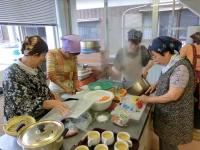”雨ときどき曇り”東の風、波の高さ50センチの予報。出勤時の雨が上がり、お昼前の野島は薄日が差しています。 ”島民学級”防府市保健センター管理栄養士の宮木明美を講師に迎え「野菜たっぷりヘルシー献立」の内容で料理教室を開講しています。本日のメニューはヒジキの胡麻和え、ミルク豚汁、アジのフレッシュトマトソース、オレンジ寒天、白ご飯の5品です。 調理台一杯に並んだお料理 |