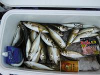 ”釣り情報”今朝の便で3人がお見えです。お昼に伺うと、新波止付け根寄りに2人、中波止先端に1人がいらっしゃいました。新波止ではサヨリがまずまずとのことでした。中波止では「アジが次々と釣れ始めたけど、午後の便で帰らなくては・・」と仰っていました。 中波止の釣果 大きいのはカンパチです。