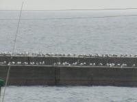 ”釣り情報”昨日からしとしと雨が降り続いています。本日の釣り人は、ルアー釣りの名人お1人です。狙いはメバルだそうです。「雨の中たいへんですね」と言うと「釣れなかったら昼の便で帰るよ」と言われてました。昼前には東の焼却場近くの消波ブロックの上で姿を見ましたが、その後は不明で、昼から姿がないので昼の便で帰られたようです。雨は昼を過ぎても降り止みません。 釣り人のいない新波止で羽を休めるカモメたち |