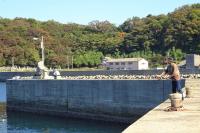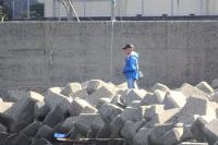 ”泳ぐものだから・・・”9人の釣り人がお見えです。アジ釣りで新波止手前道路沿いに2人、中波止中程に3人、中波止先端に2人、東の波止から外向きに1人入られ、もう1人はエギングです。今日は、午後に講座を控えているため早めに伺いました。アジ釣りは、道路沿い、中波止ともにほとんど釣れていません。満潮直後で、まだ潮が動いていないのかもしれません。しかし、中波止から東の波止を見てみると、キラキラと光る魚が釣れているようです。多分、アジと思われます。ここ最近は、アジが中波止中程を中心に釣れていましたが、今日のアジの群は東の波止寄りにいるのでしょうか⁇中波止の常連さんいわく、『泳ぐもんじゃから、(どこにアジが居るか)分からんにいね!』。その内、釣れれば良いのですが⁉(写真は、エギングでよく来られる市内のTさんです。) |