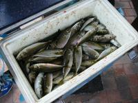 ”晴れ”今日は、ほとんど風も無く暑いくらいの野島です。 昼の取材で、新波止場に行ったところ、先端沖合いにアジの群れでしょうかナブラが見えました(下の写真)30分以上海面がざわめき、ジャバ、ジャバと音も聞こえました。地元の方にうかがうと、近くの瀬にスズキの群れが見えたとのこと。 堤防のすぐ近くを40センチ級のボラの群れが泳いでいくのも見えました。 右の写真はYさんの釣果(25センチの良型揃い)→ |