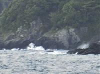 ”台風の余波・・・?”台風24号の余波でしょうか?朝間は大したことが無かったのに、昼頃から北北西の風が強くなり、波も高くなっています。写真は、津久見浜海水浴場東隣の丸山の様子です。海岸では、数メートルの高さで波しぶきが上がっています。これからの季節は、季節風の影響で波が高くなる日が多くなります。