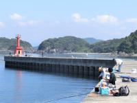 ”魚密度、高いようです”漁村センター前の古波止周りの海を見てみると、お決まりのスズメダイの他に、クロ、チヌ、メバル、サンバソウ、メイボ、ギザミ等が泳いでいます。今日は、ボラやスズキの姿も見えます。朝の連絡船で、6人の釣り人が来られました。その内、3人が新波止、1人が中波止に入られました。他の2人は、東の波止に向かわれたようです。新波止では、2人のベテランがクロを狙われており、手の平超えのクロと大型のメイボを釣っていらっしゃいます。新波止のもう1人は、イカ釣りのベテランさんです。移動して釣られているので、釣果は不明です。中波止では、宇部のKさんがアジを釣られており、17~20センチ超えを午前中に20匹余り釣られています。東の波止の状況は、時間の関係で取材に行けず分かりませんでした。