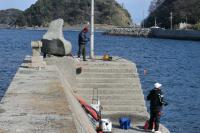 ”風が・・・微妙”朝の連絡船で5人の釣り人がお見えです。野島到着後から北風が強まり、新波止にクロ釣りで入られた常連のTさんは、早々と竿をたたまれました。中波止先端近くにアジ釣りで入られた宇部市のⅯさんは、風を避けて桟橋方向に向けて仕掛けを飛ばしていらっしゃいます(写真)。釣果は、午前中に型の良い(25センチ前後)アジが数匹。外向きに投げられないので、なかなか数が出ません。東の波止先端近くでは、1人がメバルを狙っていらっしゃるようで、時折、竿が曲がっています。他に新波止手前の道路沿いで常連さんがアジを釣られていましたが、お聞きすると1匹しか釣れなかったとのことです。あとの2人はルアー中心の釣りでしたが、そのうちのお1人、東京から帰省中の山口市の方に聞いてみたところ、小さいメバルが釣れただけとのことでした。4月に再び帰省される予定とのことで、『アジ釣り用の道具を整えて、また来ます!』と言っていらっしゃいました。