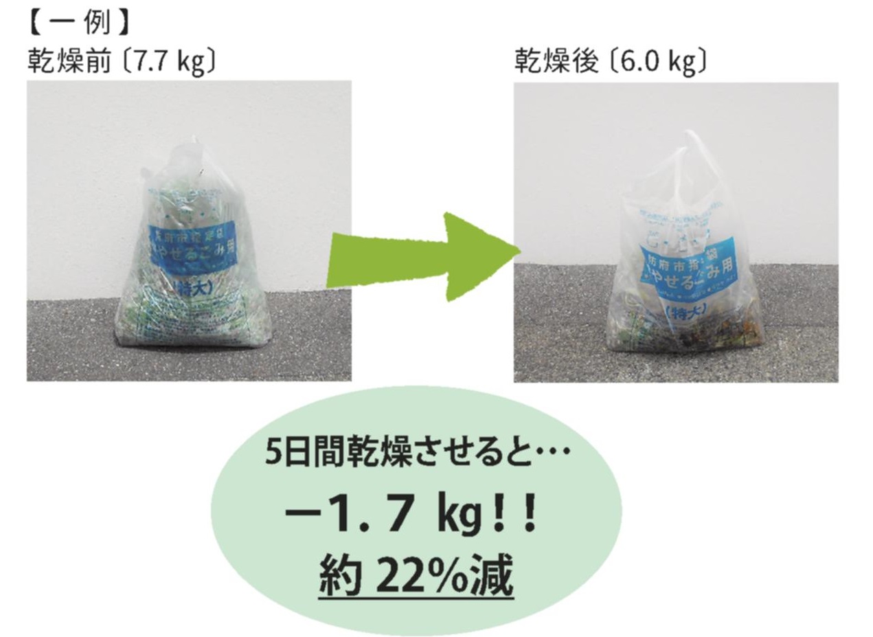 〇家庭から出る生ごみの約80%が水分です。水分を減らすことが、生ごみ減量のための近道です。