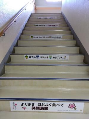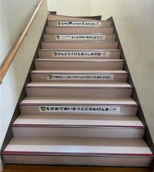 登園して玄関に入ると一番に見える階段なので子どもたちはステッカーに気付き、一生懸命ひらがなを読んでいました。健康につながる習慣を身につけてほしいと思います。