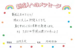 今後、大人として社会に貢献できる能力と人間性を磨き、優しい心をより一層養ってください。