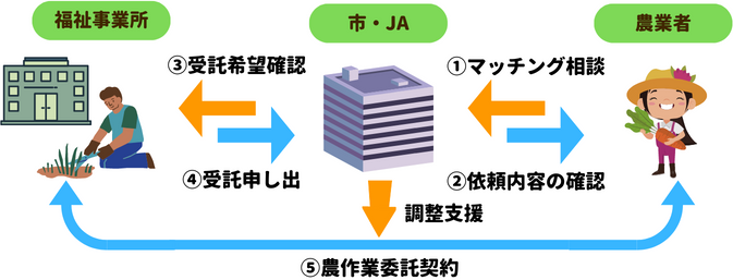 農福連携に関心があるものの、これまで福祉事業所との繋がりがなく、「どこの福祉事業所に依頼したらいいか分からない」農業者を支援するため、市とJA(山口県農業協同組合 防府とくぢ統括本部)で、農業者と福祉事業所とのマッチング(農作業委託契約の仲介、調整、支援)を行います。